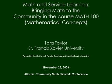 <Notice: Removed> Math and Service Learning: Bringing Math to the Community in the course MATH 100 (Mathematical Concepts) Tara Taylor St. Francis Xavier University Funded by the McConnell Faculty Development Fund for Service Learning November 25, 2006 Atlantic PowerPoint PPT Presentation