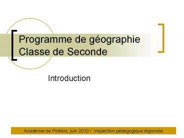 Programme de g ographie Classe de Seconde Introduction Acad mie de Poitiers, juin 2010 / Inspection p dagogique r gionale Continuit du coll ge Notions Modes d ... – PowerPoint PPT presentation