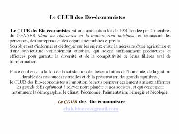 <Notice: Removed> Le CLUB des Bio- PowerPoint PPT Presentation