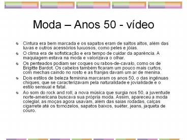 Moda Anos 50 - v deo Cintura era bem marcada e os sapatos eram de saltos altos, al m das luvas e outros acess rios luxuosos, como peles e j ias. – PowerPoint PPT presentation