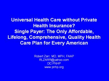 <Notice: Removed> Universal Health Care without Private Health Insurance? Single Payer: The Only Affordable, Lifelong, Comprehensive, Quality Health Care Plan for Every American Robert Zarr, MD, MPH, FAAP RLZARR@yahoo.com DC PNHP www.pnhp.org PowerPoint PPT Presentation