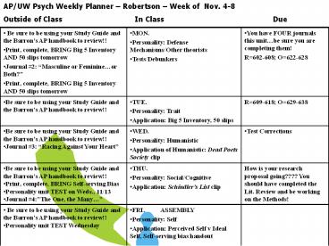 Be sure to be using your Study Guide and the Barrons AP handbook to review!! Print, complete, BRING Big 5 Inventory AND 50 slips tomorrow Journal 2 Masculine or Feminineor Both? Print, complete, BRING Big 5 Inventory AND 50 slips tomorrow MON. Personality Defense Mechanisms/Other theorists Tests/Debunkers You have FOUR journals this unitbe sure you are completing them! R602-608 O622-628