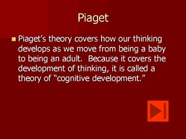 Piaget Piaget s theory covers how our thinking develops as we move from being a baby to being an adult. Because it covers the development of thinking, it is called ... – PowerPoint PPT presentation