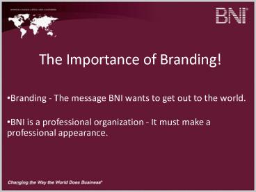 image, BNI will be the entity to decide. - BNI is open to ideas however, the ideas need to