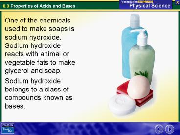 Title: One of the chemicals used to make soaps is sodium hydroxide. Sodium hydroxide reacts with animal or vegetable fats to make glycerol and soap.