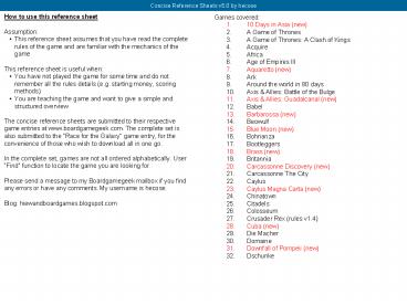 How to use this reference sheet Assumption: This reference sheet assumes that you have read the complete rules of the game and are familiar with the mechanics of the game – PowerPoint PPT presentation