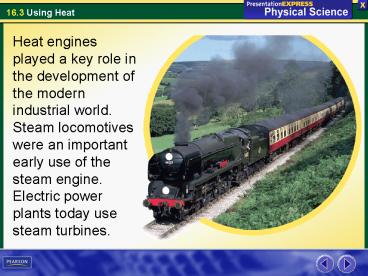 <Notice: Removed> Heat engines played a key role in the development of the modern industrial world. Steam locomotives were an important early use of the steam engine. Electric power plants today use steam turbines. PowerPoint PPT Presentation