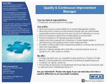 MAIN DUTIES All aspects of the Quality Management System ISO90012000 including working with the Management Team in its development and for its compliance. Manage and ensure other relevant approvals are maintained on each site such as but not limited to ATEX, PED, UKAS Take a lead role in the management of customer complaints. Ensure Internal Audits are carried out across all sites in a timely manner to a defined internal audit plan. Manage and ensure WIKA Instruments Ltd Health and Safety Policy adheres to current legislation across all sites. Ensure procedures and work instructions meet the WIKA standards agreed with the relevant Centre of Excellence. Responsible for the on-going development of the Quality module within our computer system to reflect best practice within WIKA across all sites. Help identify Continuous Improvement potential within the UK sites to improve the operational performance over all functions in the business. Be responsible for the training and promoting of a Continuous improvement culture in the whole enterprise. Ensure all the actions from the continuous improvement events are followed through by the relevant person. Work with the WIKA Group continuous improvement teams to ensure the UK is using the latest techniques and ideas.
