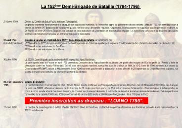 30 juillet 1795 La 152ème Demi-Brigade quitte les bords du Rhin pour les Alpes Maritimes La paix signée avec la Prusse en avril 1795 permet au Directoire de la République de soustraire une partie des troupes de lEst au profit de lArmée dItalie en campagne contre les Austro-Piémontais. En 40 jours de longues marches, exécutées sous la chaleur de lété, la 15-2, forte de 1500 hommes aux ordres du Commandant PROMPT, rejoint la Méditerranée. Seuls 1206 hommes parviennent à destination et sont affectés le 23 septembre au Corps Masséna, à Loano, sur la côte à environ une centaine de kilomètres au Nord-Est de Nice.