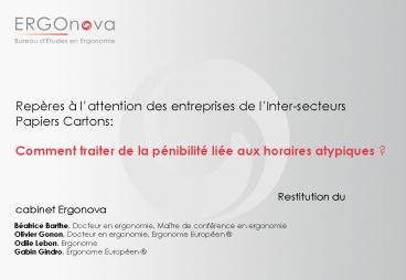 Avis, perceptions et attentes Personnels Caractéristiques de la population Age ? Ancienneté au poste ? Au type dhoraire ? Dans lentreprise ? Genre ? Situation familiale ? Métier et poste occupé ? Durée dexposition aux horaires atypiques ? Distance domicile-travail ? Problèmes de santé ? Point de vue sur les horaires en place ? Attentes vis-à-vis des parcours professionnels ?