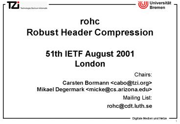 <Notice: Removed> rohc Robust Header Compression 51th IETF August 2001 London PowerPoint PPT Presentation