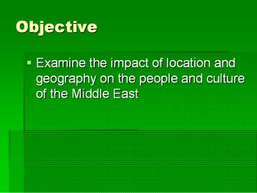 Objective Examine the impact of location and geography on the people and culture of the Middle East Big Ideas Early Civilizations of the Middle East First ... – PowerPoint PPT presentation