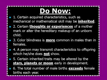 offspring which he/she does not show. - 5. Certain inherited traits may be altered by the