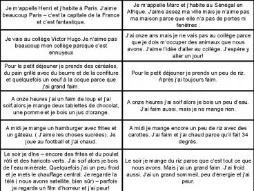 Je mappelle Henri et jhabite à Paris. Jaime beaucoup Paris cest la capitale de la France et cest fantastique. Je mappelle Marc et jhabite au Sénégal en Afrique. Jaime assez ma ville mais je naime pas ma maison parce que elle na pas de portes ni fenêtres .
