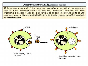 1) La resposta humoral sinicia quan un macròfag o una cèllula emparentada fagocita a un microorganisme i el destrueix, presentant partícules del micro-organisme o antígens (Ag) en la superfície de la seva membrana units al CMH (complex major dhistocompatibilitat). Això fa, també, que el macròfag produeixi les interleucines.