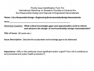 Priority Issue Identification Form For International Workshop on Research Priorities to Advance the Eco-Responsible Design and Disposal of Engineered Nanomaterials – PowerPoint PPT presentation