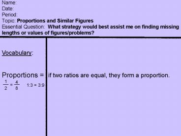 Title: Name: Date: Period: Topic: Proportions and Similar Figures Essential Question: What strategy would best assist me on finding missing lengths or values of figures/problems?