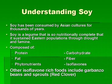Substantial data regarding the benefits of soy in cardiovascular health, prostate health, menopausal symptom relief, and osteoporosis prevention as well as other important areas.