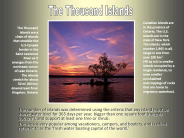 The%20Thousand%20Islands%20are%20a%20chain%20of%20islands%20that%20straddle%20the%20U.S-Canada%20border%20in%20the%20Saint%20Lawrence%20River%20as%20it%20emerges%20from%20the%20northeast%20corner%20of%20Lake%20Ontario.%20The%20islands%20stretch%20for%20about%2050%20mi%20(80 PowerPoint PPT Presentation