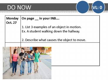 Monday Oct. 27 On page __ in your INB. 1. List 3 examples of an object in motion. Ex. A student walking down the hallway. 2. Describe what causes the object to move.