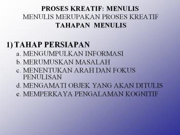PROSES KREATIF: MENULIS MENULIS MERUPAKAN PROSES KREATIF TAHAPAN MENULIS PowerPoint PPT Presentation