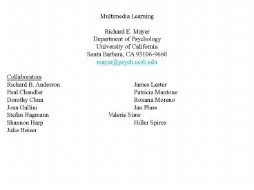 1 Multimedia Learning Richard E. Mayer Department