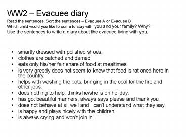 WW2 Evacuee DiaryCut out the sentences. Sort the