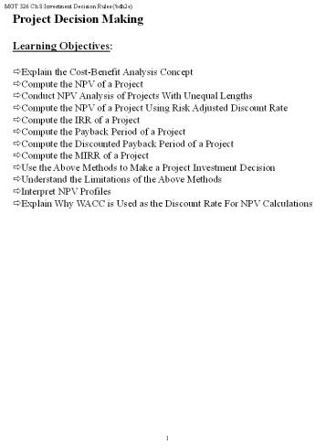 greater than the cost - An NPV lt 0 means you lose money the cost is