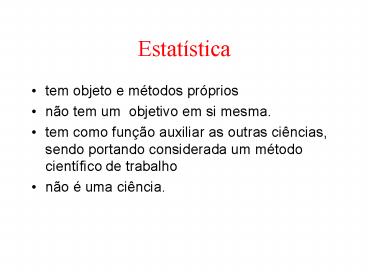 Estat stica tem objeto e m todos pr prios n o tem um objetivo em si mesma. tem como fun o auxiliar as outras ci ncias, sendo portando considerada um m todo ... – PowerPoint PPT presentation