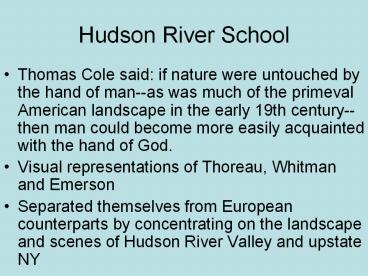 Hudson River School Thomas Cole said: if nature were untouched by the hand of man--as was much of the primeval American landscape in the early 19th century--then man ... – PowerPoint PPT presentation
