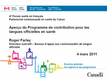 Title: Aper u de la LLO et du r le de Sant Canada pour la Partie VII Subject: Pr sentation au SMA de la DGRP Author: Roger Guillemette Last modified by – PowerPoint PPT presentation