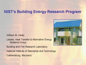 A. Hunter Fanney, Chief Building Environment Division Hunter.Fanney_at_nist.gov www.bfrl.nist.gov/863/bed.html William Healy, Leader Heat Transfer and Alternative Energy Systems Group William.Healy_at_nist.gov 301-975-4922 www.bfrl.nist.gov/863/heat_transfer_group/index.htm
