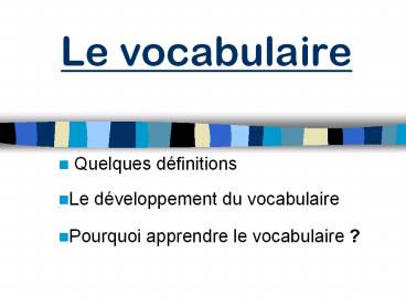 Maîtrise du sens des mots - Dans un texte, relever les mots dun même domaine (le vocabulaire de la mer). - Utiliser des synonymes et des mots de sens contraire dans les activités dexpression orale et écrite. Maîtrise du sens des mots - Utiliser le contexte pour comprendre un mot inconnu vérifier son sens dans le dictionnaire. - Définir un mot connu en utilisant un terme générique adéquat (mots concrets un pommier est un arbre fruitier). - Commencer à identifier les différents niveaux de langue. Maîtrise du sens des mots - Distinguer les différents sens dun verbe selon sa construction (jouer, jouer quelque chose, jouer à, jouer de, jouer sur). - Identifier lutilisation dun mot ou dune expression au sens figuré. - Classer des mots de sens voisin en repérant les variations dintensité (bon, délicieux, succulent). - Définir un mot connu en utilisant un terme générique adéquat et en y ajoutant les précisions spécifiques à lobjet défini.